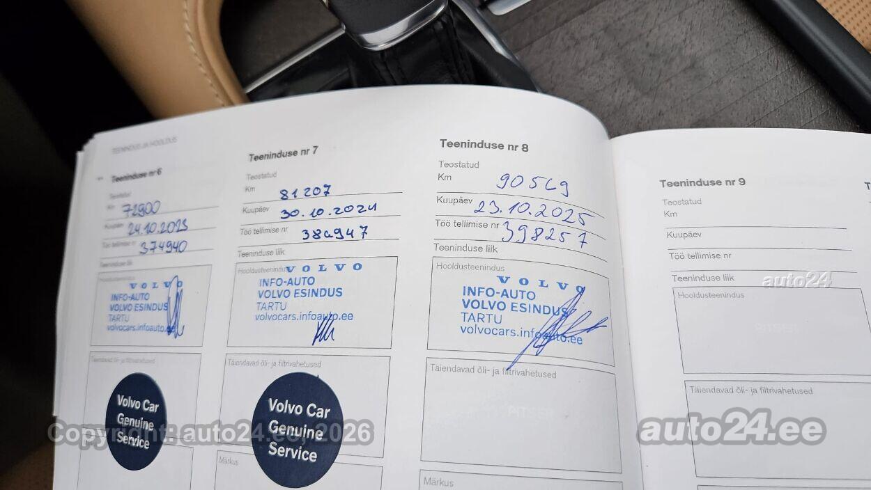 Lisad: automaat käigukast, kliimaautomaatik, automaatpidurdussüsteem, roolivõimendi (kiirustundlik), kesklukustus (puldiga), ABS pidurid, turvapadi, elektrooniline seisupidur, turvakardinad, immobilisaator, signalisatsioon (kaldeanduriga, mahuanduriga, kahepoolse sidega), lisapidurituli, stabiilsuskontroll, kokkupõrget ennetav pidurisüsteem, pidurdusjõukontroll, sõiduraja hoidmise abisüsteem, sõiduraja vahetamise abisüsteem, liiklusmärkide tuvastus ja kuvamine, pimenurga hoiatus, veojõukontroll, vihmasensor, ISOFIX lasteistme kinnitus, kõrvalistuja turvapadja väljalülitamise võimalus, automaatne paigalseismise funktsioon / mägistardi abi, juhi väsimuse tuvastamise süsteem, mägipidur, jahutusega kindalaegas, valgustuspakett, udutuled (eesmised, tagumine, kurvitule funktsiooniga), esitulede pesurid, LED (päevatuled, tagatuled, lähituled, kaugtuled), päevasõidutulede automaatne lülitus, kaugtulede ümberlülitamise assistent, kurvituled, talverehvid (naastrehvid), valuveljed (19 Tolli, Volvo orig.), reguleeritav roolisammas (kõrgus ja sügavus), multifunktsionaalne rool, nahkkattega rool, stereo (MP3, USB pesaga, mälukaardi pesaga, originaal), helivõimendi, kõlarid, Apple CarPlay, Android Auto, ekraan (ees), navigatsiooniseade (hääljuhtimisega), autokompuuter, käed vabad süsteem, iluliistud salongis (puitdekoor), taskud esiistmete seljatugedes, jalamatid (tekstiilist), pagasiruumi matt, topsihoidjad (ees, taga), nahkkattega käigukanginupp, tume laepolster, nahkpolster, õhuga reguleeritav iste, 2x elektriliselt reguleeritavad istmed (2x mäludega), istmed reguleeritava kõrgusega (juhiiste, kõrvalistuja iste), 4x istmesoojendused, reguleeritava kumerusega seljatugi (juhiiste, kõrvalistuja iste), massaažifunktsiooniga istmed (juhil, kõrvalistmel), ventileeritavad istmed (ees), käetugi ees (laekaga), käetugi taga (laekaga), kaassõitja istme seljatugi allaklapitav, tagaistme seljatugi allaklapitav, Comfort istmed, elektrilised välispeeglid (soojendusega, kokkuklapitavad, mäluga), elektrilised akende tõstukid, toonitud klaasid, püsikiiruse hoidja (eessõitjaga distantsi hoidev), peeglid päikesesirmides (valgustusega), Webasto mootori eelsoojendus, Webasto salongi eelsoojendus, salongi lisasoojendus, automaatselt tumenevad peeglid (sees, väljas), uste sisevalgustus, kohtvalgustid, parkimisandurid (ees, taga), parkimiskaamera, Coming-/Leaving-Home funktsioon, digitaalne näidikutepaneel, info kuvamine esiklaasile, tagavararatas, võtmeta avamine, võtmeta käivitus, start-stopp süsteem, reisiarvesti, 12v pistikupesad, paigaldatud tulekustuti, reguleeritav vedrustus (elektriliselt, jäikus), pakiruumi avamine elektriliselt (jalaviipega, puldist), pagasikate (automaatne), katusereelingud, pagasi võrk pakiruumis, kaubakinnituse konksud, elektrilise soojendusega esiklaas, tagaklaasi soojendus, välistemperatuuri näidik, aknapesupihustite sulatus, esi- ja tagarataste porikummid, tagaklaasi puhasti